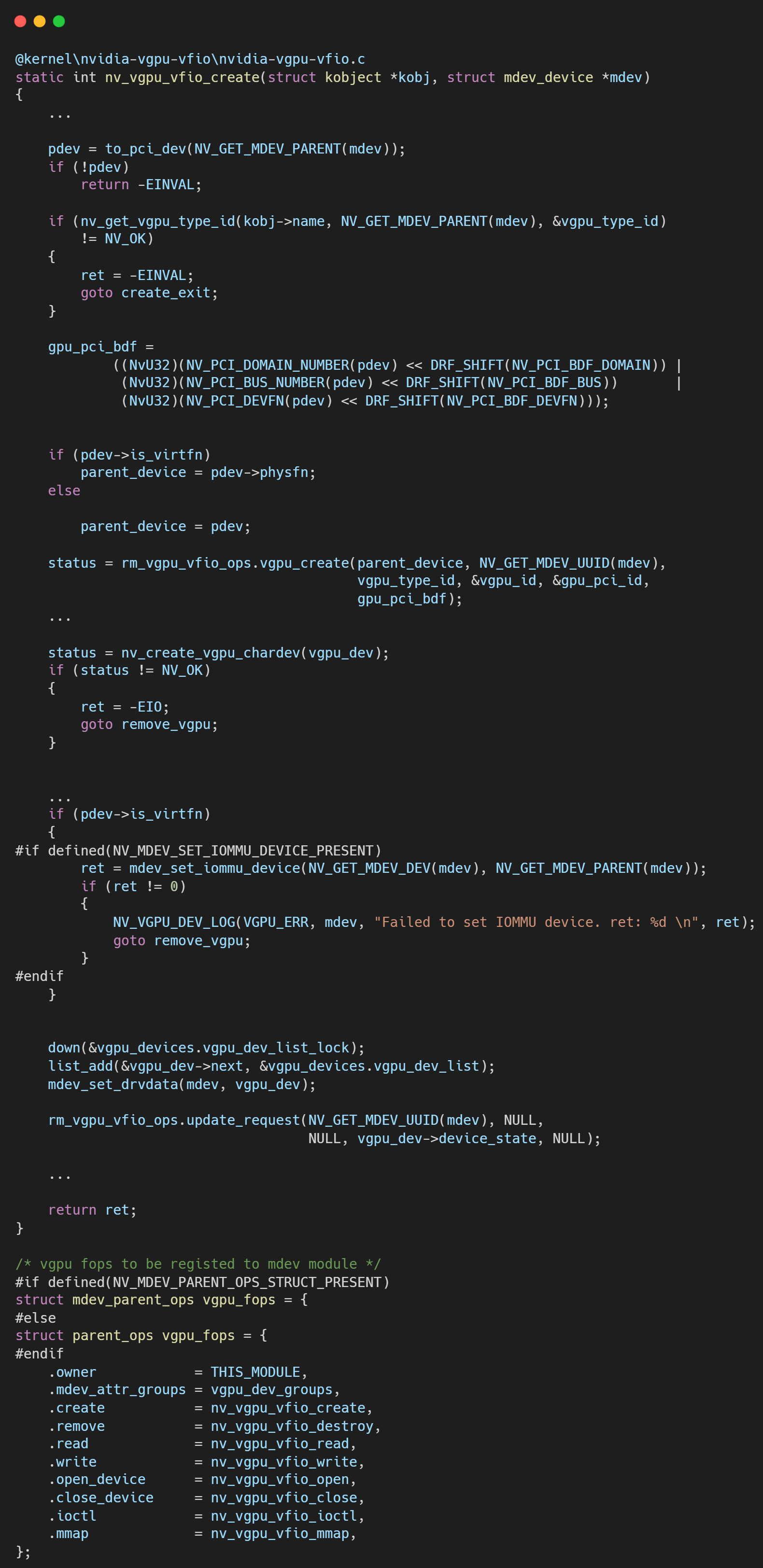 nv_create_vgpu_chardev: 为该vGPU创建一个字符设备。mdev_set_iommu_device: 将该vGPU设备与IOMMU关联起来,确保DMA访问的安全性。mdev_set_drvdata: 将vGPU的私有数据结构与MDEV设备关联,方便后续操作。