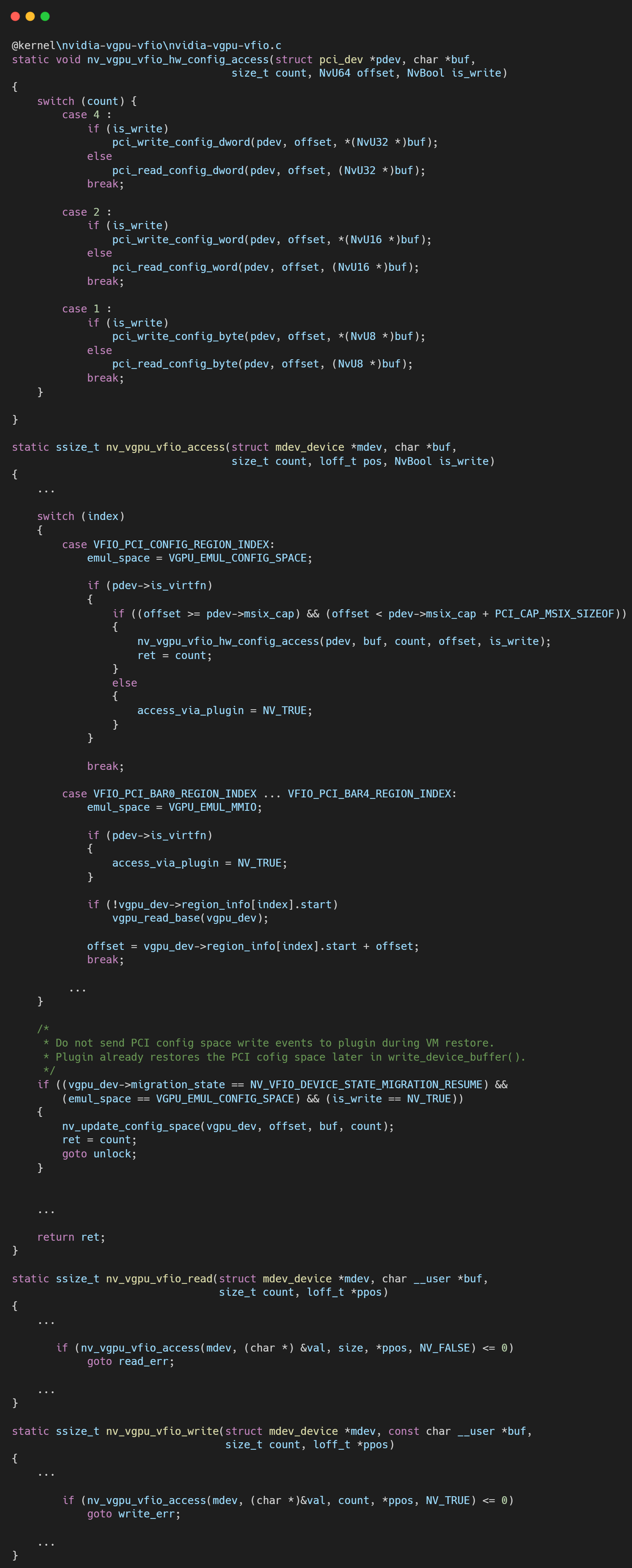 VFIO_PCI_CONFIG_REGION_INDEX): 请求被转发到nv_vgpu_vfio_hw_config_access,它通过pci_read/write_config_dword直接读写真实的PCI配置空间寄存器。这表明NVIDIA vGPU为VM提供了高度仿真的PCI设备视图。 - BAR空间 (