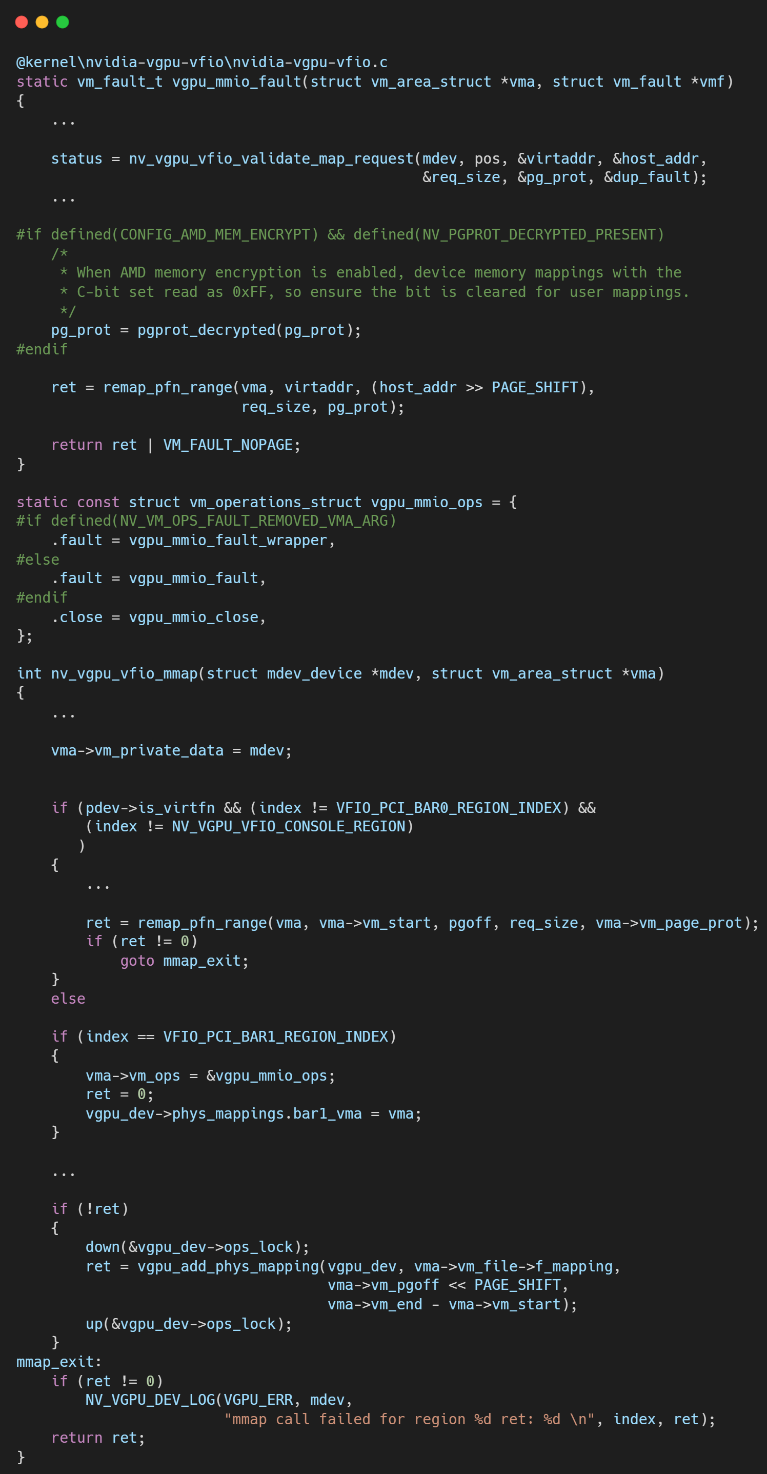 .mmap->nv_vgpu_vfio_mmap): 这是图形性能的关键。当QEMU请求mmapvGPU的显存BAR(通常是BAR1)时,nv_vgpu_vfio_mmap被调用。- 它为VMA(Virtual Memory Area)设置了