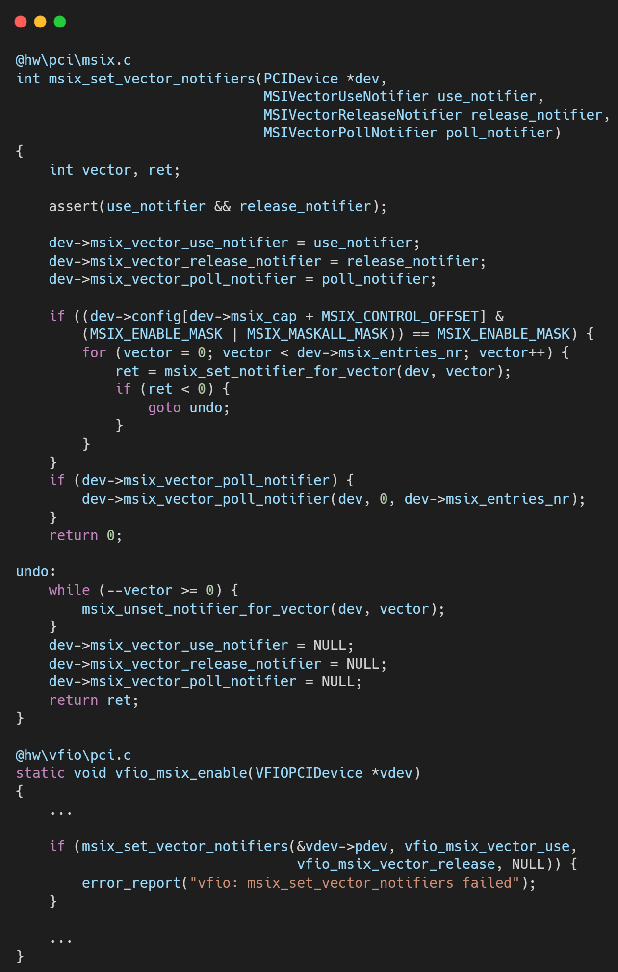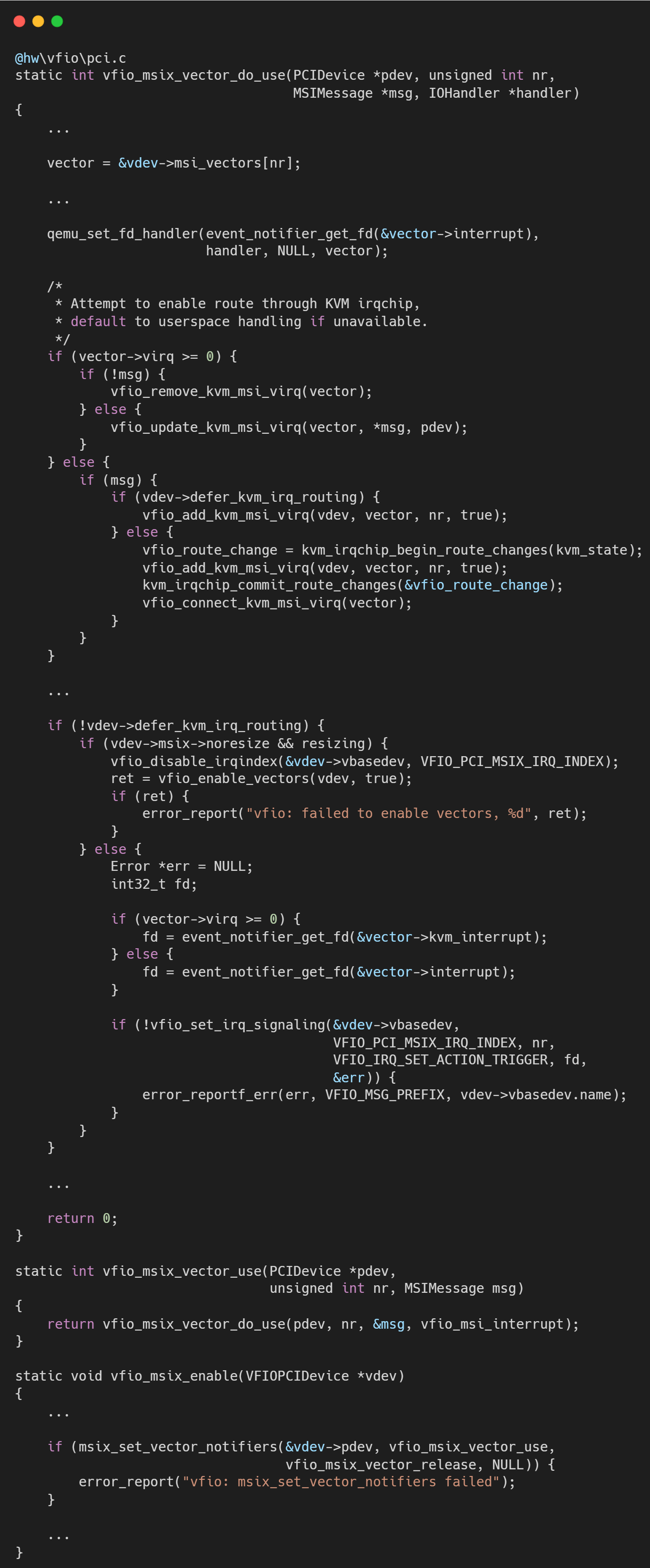 QEMU 的 MSI-X 模拟层(hw/pci/msix.c)并不知道后端是 VFIO。VFIO 必须主动注册回调。