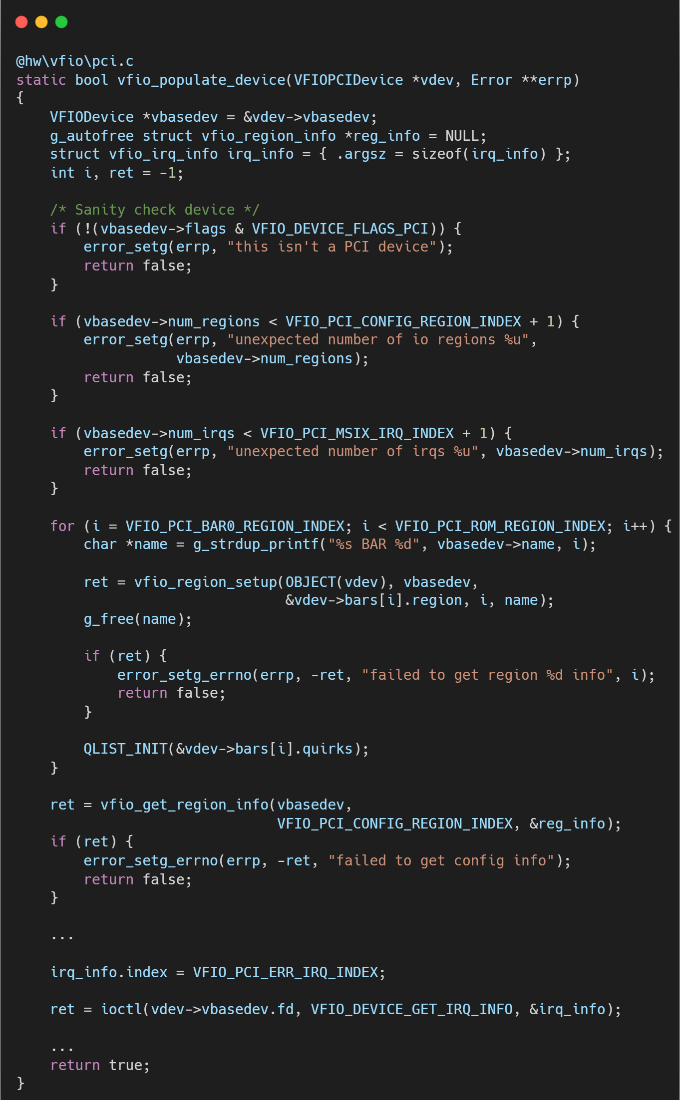 vfio_realize 是 QEMU VFIO 逻辑中最长、最复杂的函数之一。