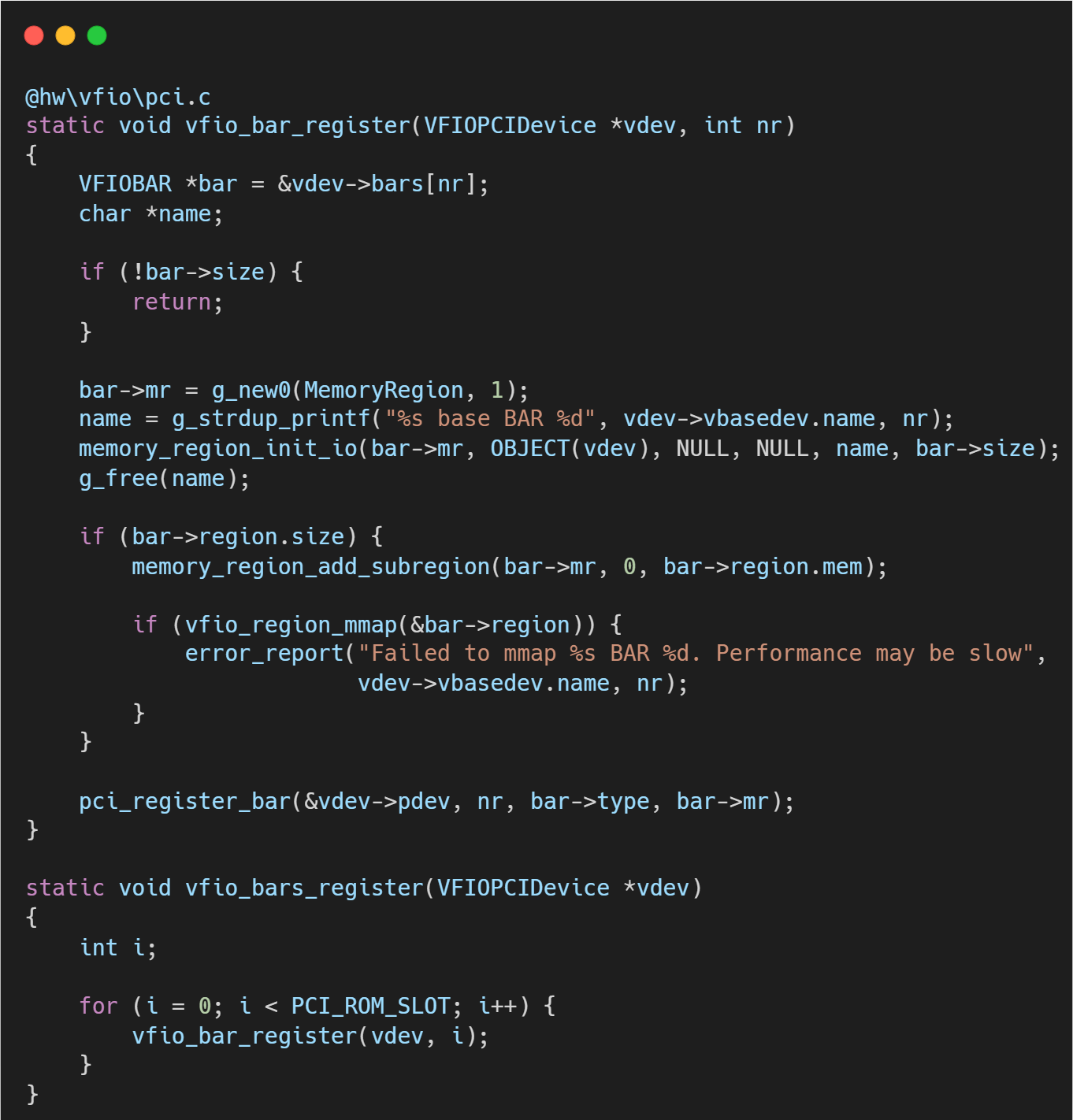 如果内核报告某个 BAR 区域支持 mmap(通常是大多数非敏感的寄存器区域),QEMU 会调用 mmap 将物理设备的 BAR 空间直接映射到 QEMU 的虚拟地址空间。