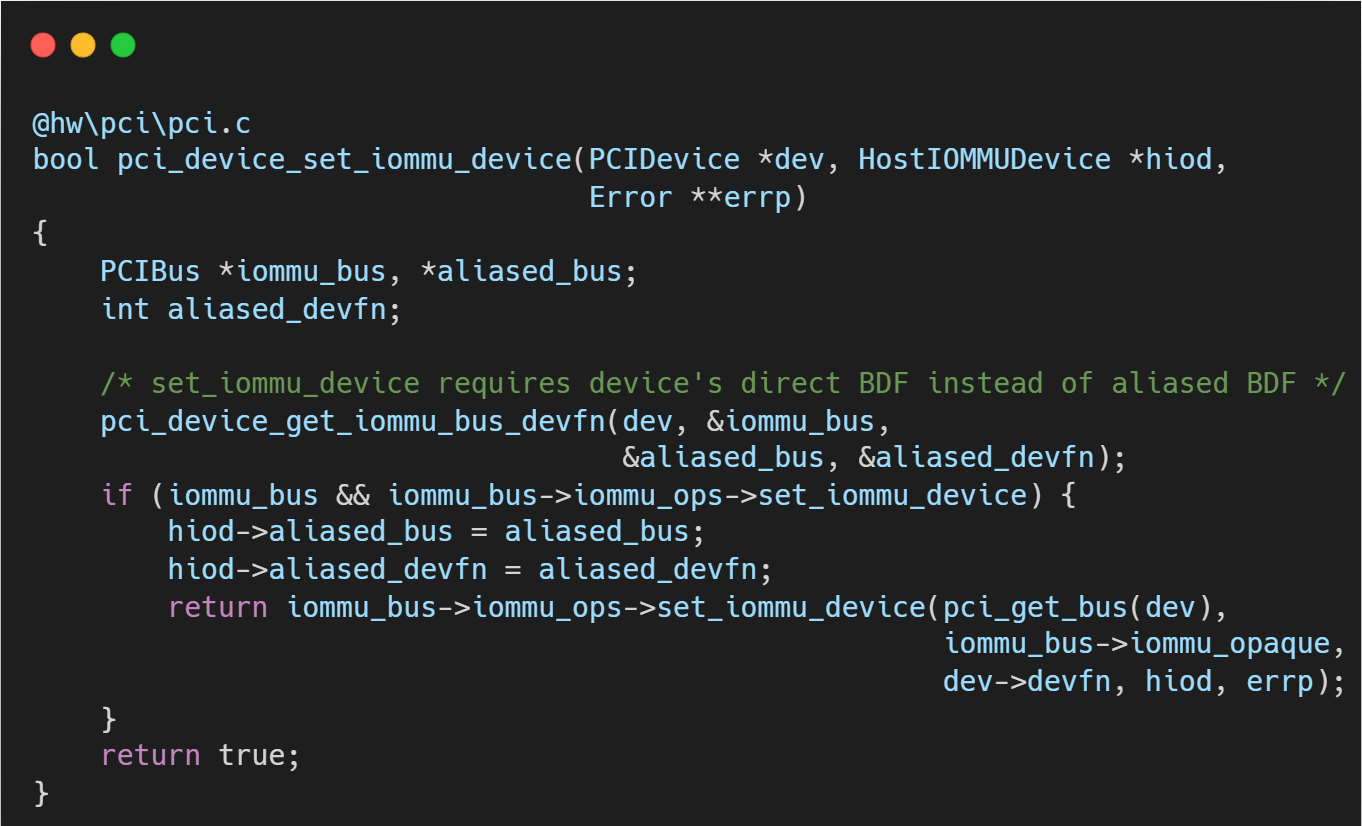 此函数将 Host 端的 IOMMU 设备上下文(HostIOMMUDevice)关联到虚拟 PCI 设备上。