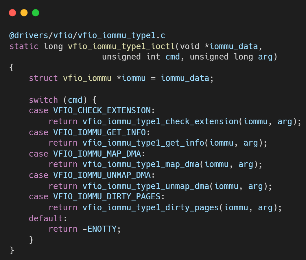 ioctl 是用户空间与IOMMU后端交互的主要通道,由 vfio_iommu_type1_ioctl 函数处理。
