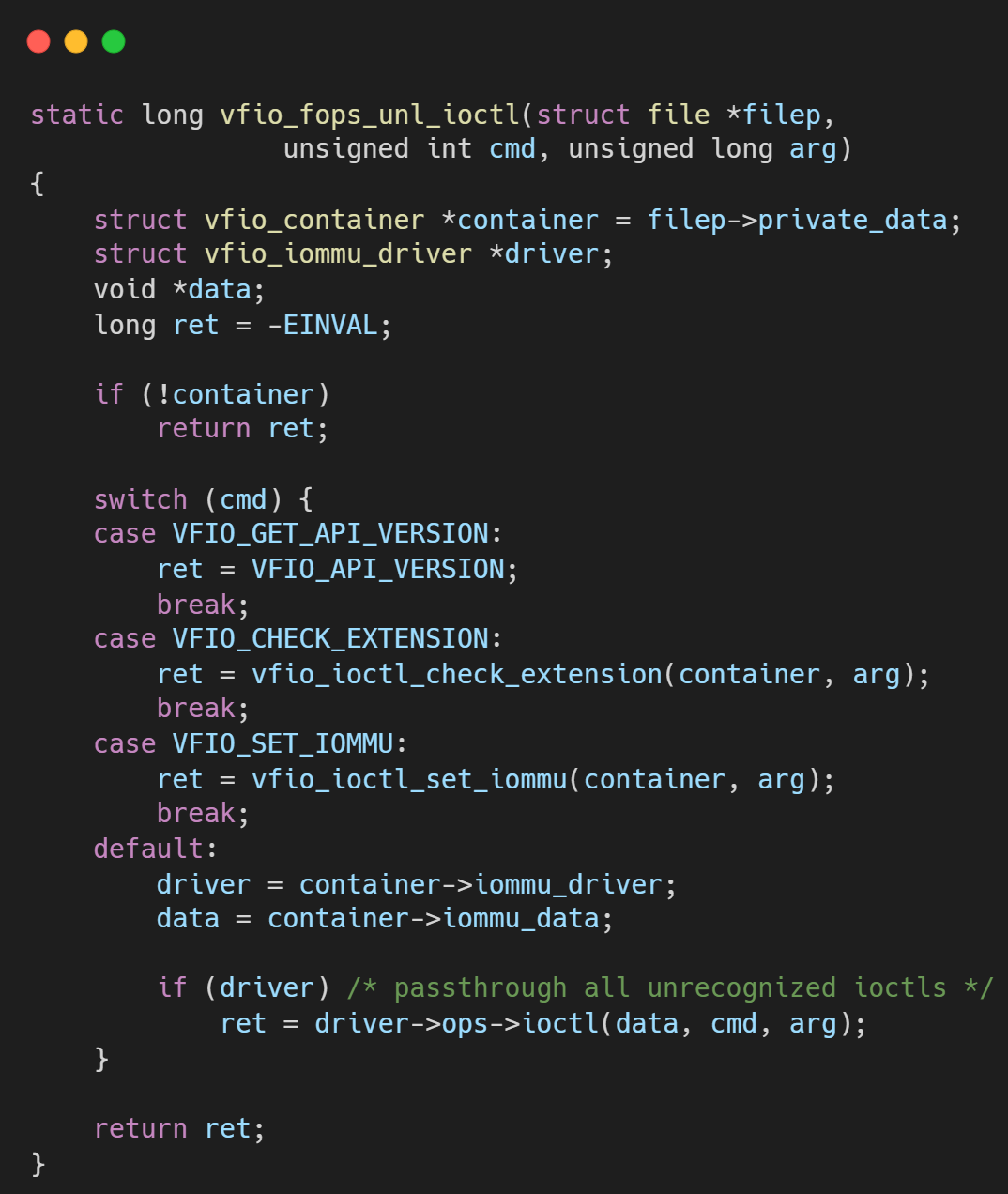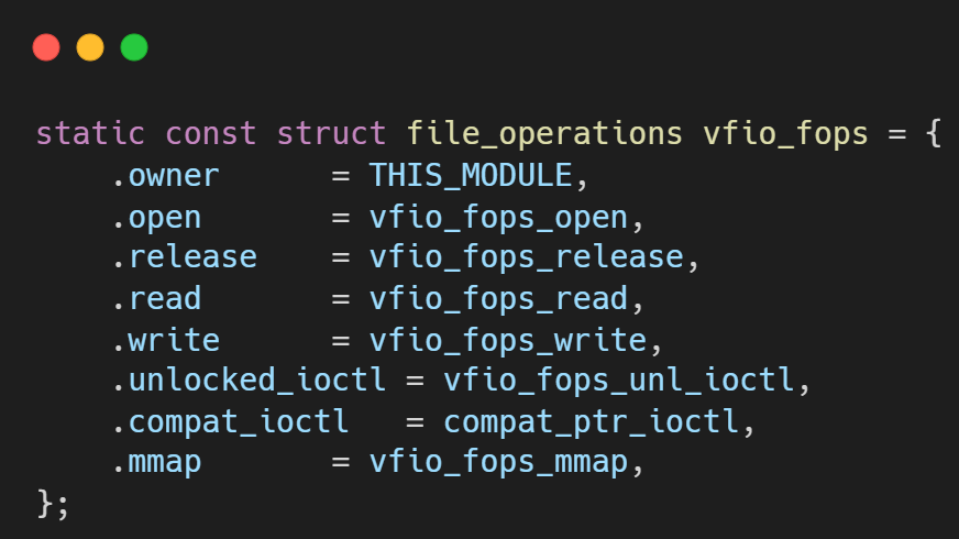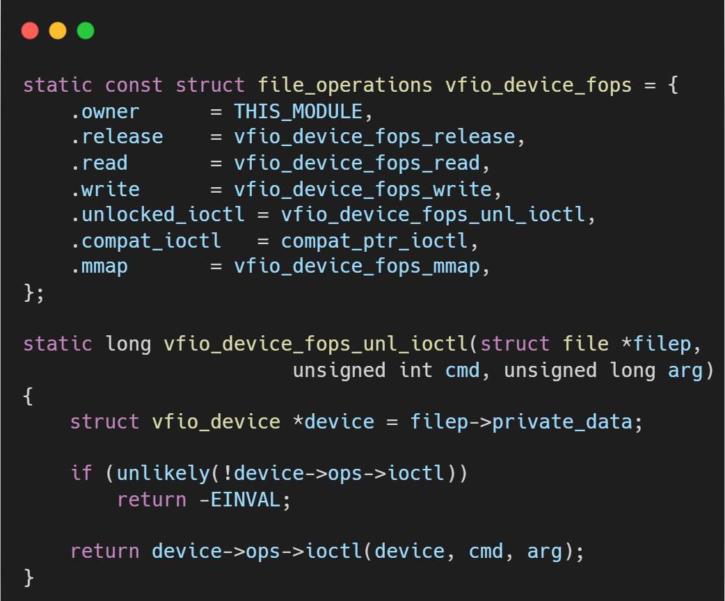 VFIO_GROUP_GET_DEVICE_FD: 用户空间通过此ioctl并提供设备名称(如 "0000:01:00.0")来请求获取一个代表物理设备的文件描述符。- 内核中的