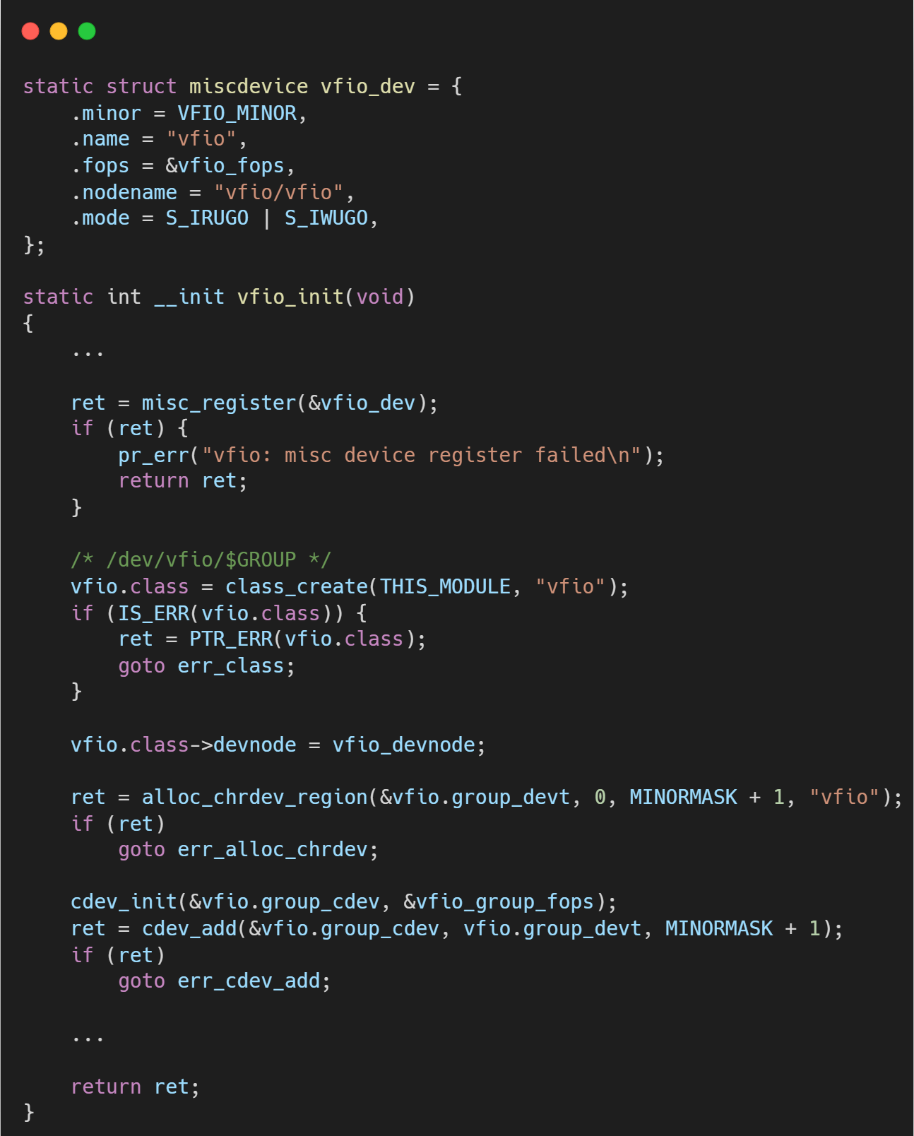 与所有内核模块一样,VFIO的生命周期始于其初始化函数 vfio_init。此函数是整个VFIO框架的基石,主要完成两项关键的字符设备注册工作: