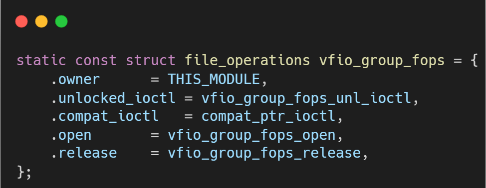 alloc_chrdev_region和cdev_init函数,为 VFIO Group 动态分配一个主设备号,并初始化其字符设备结构。内核中的每个IOMMU Group都会对应一个设备文件,例如/dev/vfio/1,/dev/vfio/2等。这些设备文件的操作由vfio_group_fops定义。