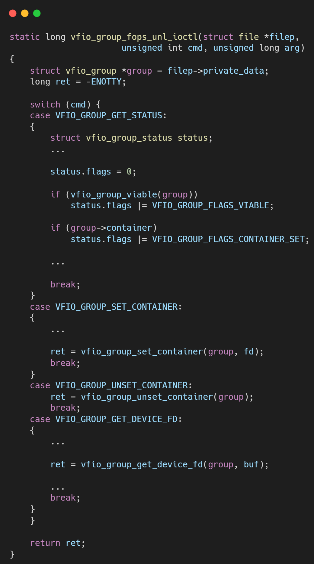 用户空间打开代表特定Group的设备文件(例如 /dev/vfio/1),获得一个Group fd。同样,关键操作也是通过 ioctl 进行,由 vfio_group_fops_unl_ioctl 函数处理。