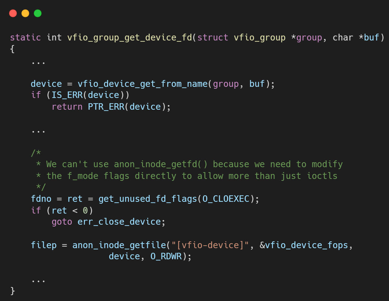 vfio_group_get_device_fd函数首先通过vfio_device_get_from_name找到对应的vfio_device结构体。 - 然后,它调用